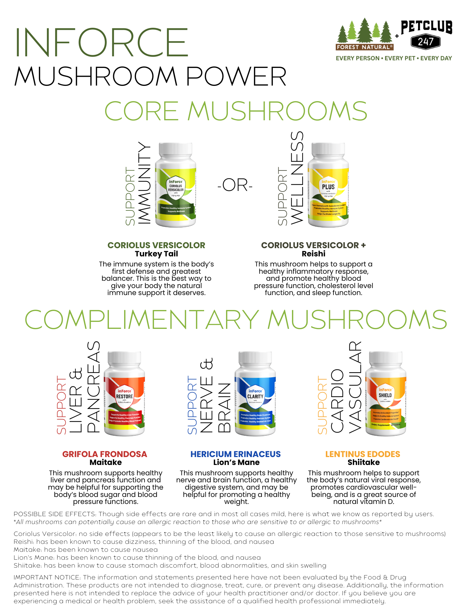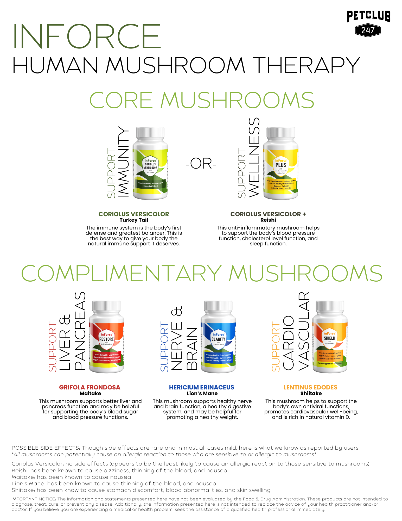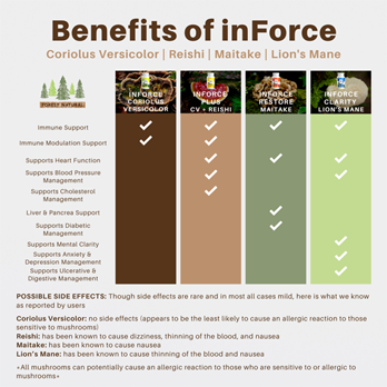 inForce is a dietary supplement made up of Coriolus Versicolor to help support the body's immune system. It is a proprietary blend and offers the best value for the money. It is a combination of both Polysaccharide-K (PSK) and Polysaccharide Peptide (PSP). inForce offers much needed immune support and it can be taken on a daily basis. This product is 100% vegan and bottled in the United States in a FDA registered bottling facility that is CGMP compliant (Current Good Manufacturing Practices).